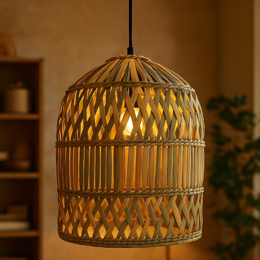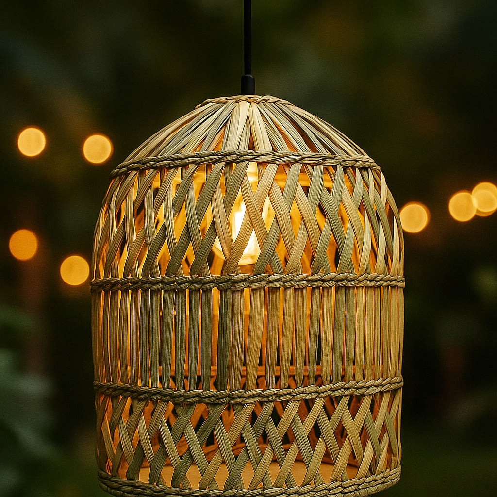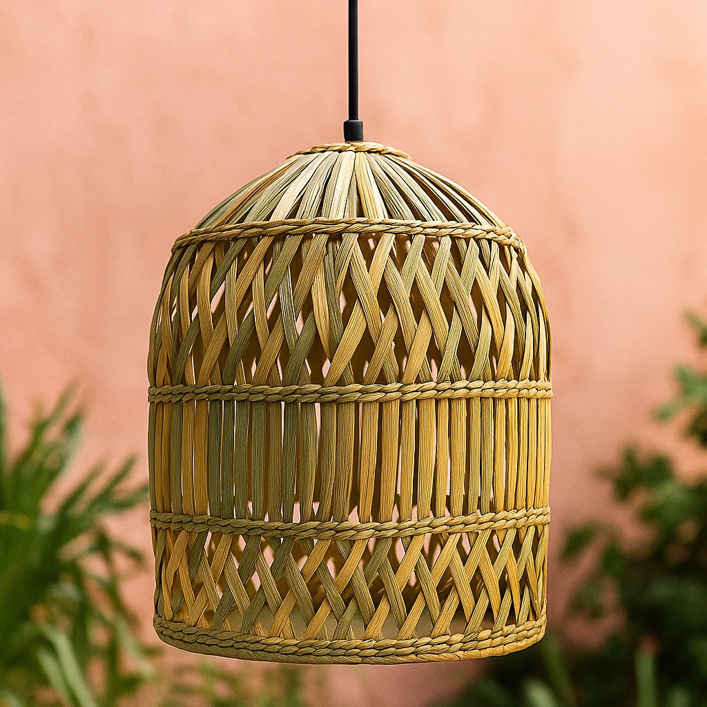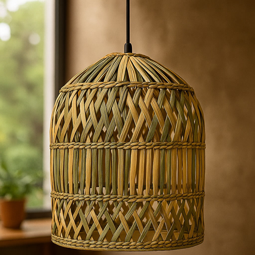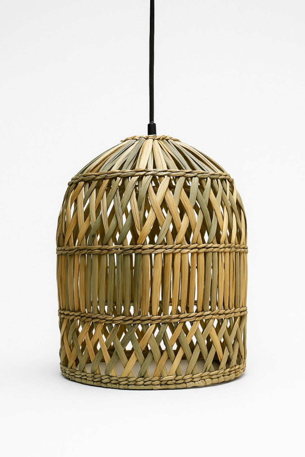 Dale personalidad y calidez a tus espacios con esta lámpara de jaula artesanal, tejida a mano con palma natural por artesanos mexicanos. Su diseño cilíndrico entrecruzado proyecta una luz suave y envolvente, perfecta para cualquier estilo.
